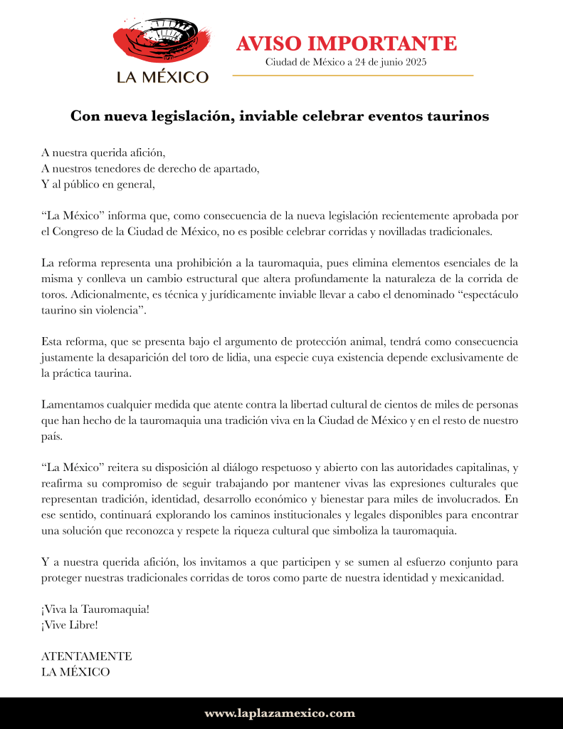 Algunos intentaron salvar la fiesta brava con «Corridas sin violencia» una versión sin sangre y sin muerte. Pero hasta la misma Plaza México lo dejó claro: «Con la nueva legislación, inviable celebrar eventos taurinos». Ese comunicado no fue un tropiezo; fue una confesión. La ovación necesita ver sufrimiento. Lo que dolía, dolía desde siempre… solo que lo llamaban cultura.