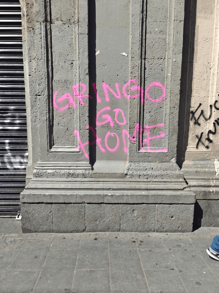Pero la protesta también se pinta. En los postes, en los muros, en baños de cafés que venden pan de masa madre a 90 pesos. Ahí están los mensajes que incomodan: “Gringo, Go Home”, “Don’t book your stay in this area”, “Save the barrio”.