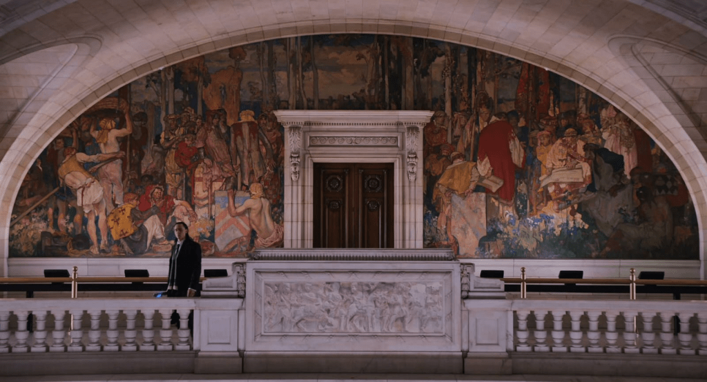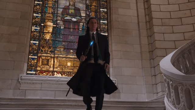 La elección de este lugar —aunque fingidamente europeo— está cargada de significado: Loki, un dios con complejo de superioridad, pronuncia su discurso sobre el orden y la obediencia rodeado de símbolos visuales de imperios antiguos, conocimiento y autoridad moral. Marvel no lo dice con palabras, pero lo muestra con arte.