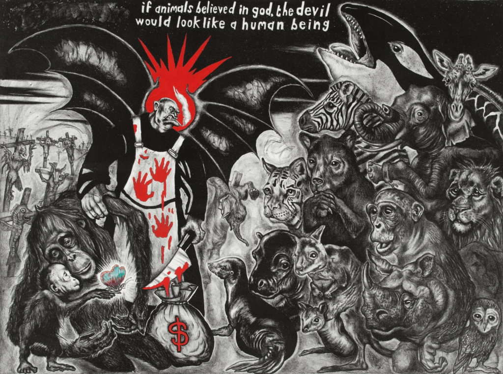 Sue Coe es una de las artistas más frontales y necesarias en la denuncia del especismo. Inglesa, ilustradora y grabadora, convirtió el arte en arma política: no estetiza la violencia, la exhibe sin maquillaje. Creció al lado de un matadero y desde entonces su trabajo gira en torno a esa maquinaria de muerte que sostiene al capitalismo: la industria cárnica, los laboratorios, los zoológicos.