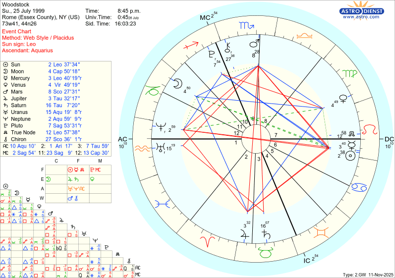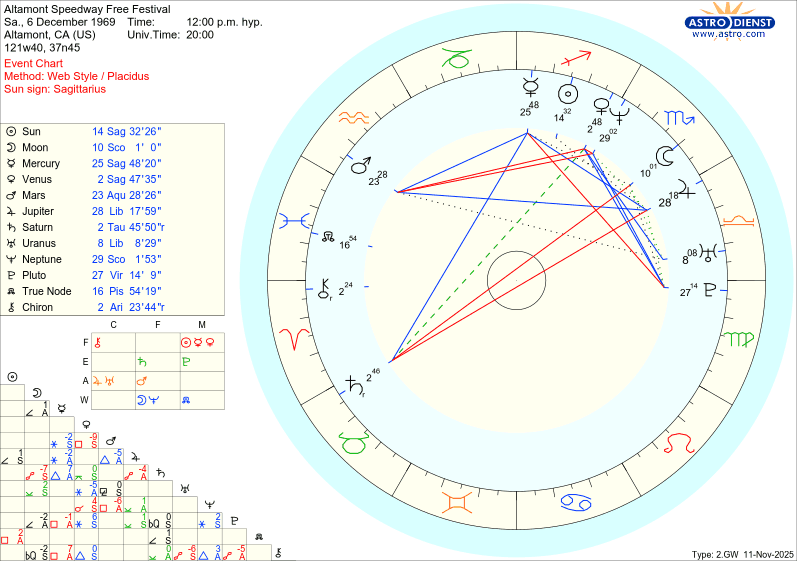 Marte en Acuario —planeta de la agresión y la acción colectiva— agitaba la energía de masas, liberando impulsos que buscaban estallar más que celebrarse. La Luna y Neptuno en Escorpio —lo oculto, muerte y transformación— sumergían las emociones en aguas turbias: paranoia, drogas, deseo de disolverse. Fue un tránsito de intoxicación y descontrol, donde lo comunitario se volvió multitud y la euforia se transformó en miedo.
